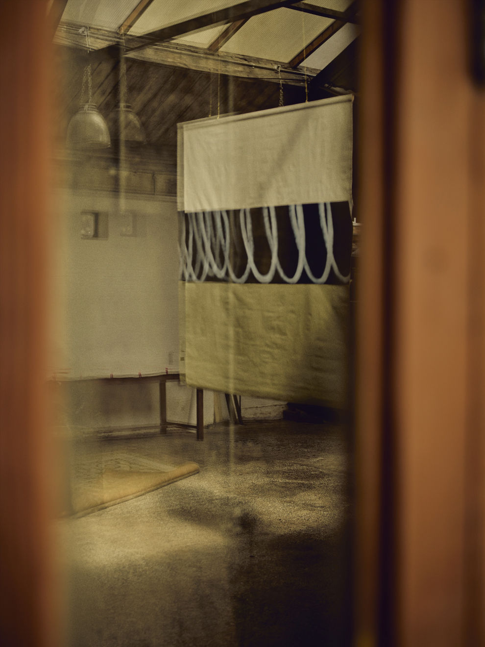 I’ve contributed three new wallhangings — a departure for me, working with fabric as a primary medium. Transparency became central to the process; I selected sheer textiles for two of the pieces to allow light to pass through, enabling the forms to be read from both sides. The green wallhanging, by contrast, is opaque — a layered composition of painted fabric and canvas that introduces a denser material presence. It sits in dialogue with ceramic works by Nicholas Lees.